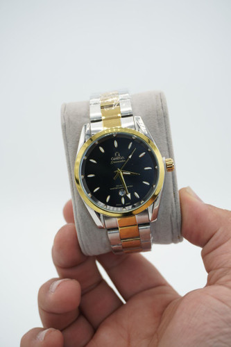 ساعت مچی مردانه امگا سیمستر نقرهای طلایی صفحه مشکی